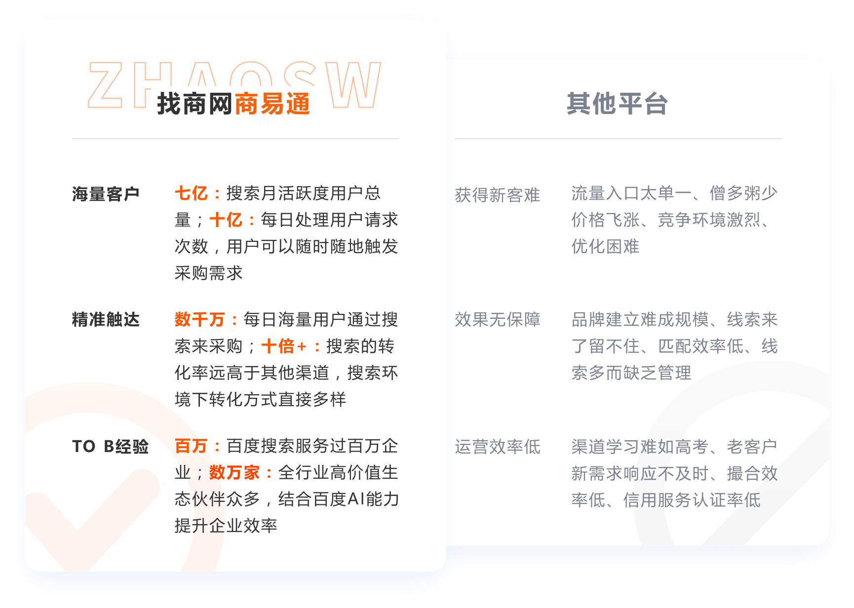 【找商网】 (www.zhaosw.com) 隶属于杭州云搜网络技术有限公司旗下产品,2019年初联合百度爱采购平台携手打造B2B行业新的生态圈,重磅推出B2B新营销云武器——“商易通”、“易销车”、“采优宝”等服务项目,为中小企业提供从品牌、建站、流量、运营、认证全链路打通的一站式B2B电商解决方案,赋能助力中小企业发展。上线仅不足6个月,【找商网】平台就吸引了大批商家入驻,迅速在B2B市场站稳脚跟。2019年入驻【找商网】平台的客户数量突破10000家,成为百度爱采购近20家TP合作伙伴中首家突破万单会员数量的服务商。截止2022年9月,找商网付费会员数量已达43816家,成为百度爱采购会员体量中最大的TP服务商,商铺行业品类已全面覆盖“工业制造、农业生产、商业贸易、办公批发”等30+主行业、873个细分行业,商品数据高达5亿+。